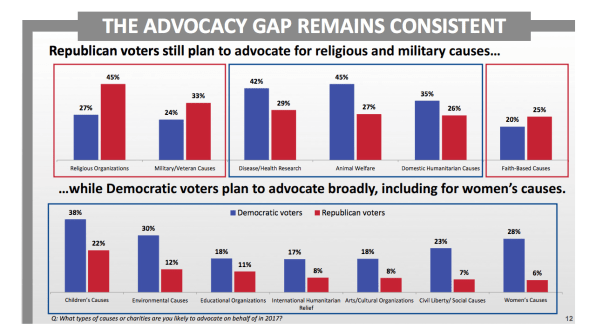 The report tracks which administration moves, in particular, have spurred each camp into charitable action. Among Democrats, that includes Trump enacting a rule to block funding for nongovernmental organizations that provide abortions, the controversial appointments of Scott Pruitt to the EPA and Betsy Devos as Secretary of Education, and actions to dismantle the Affordable Care Act and keep travelers from Muslim countries outside our borders.